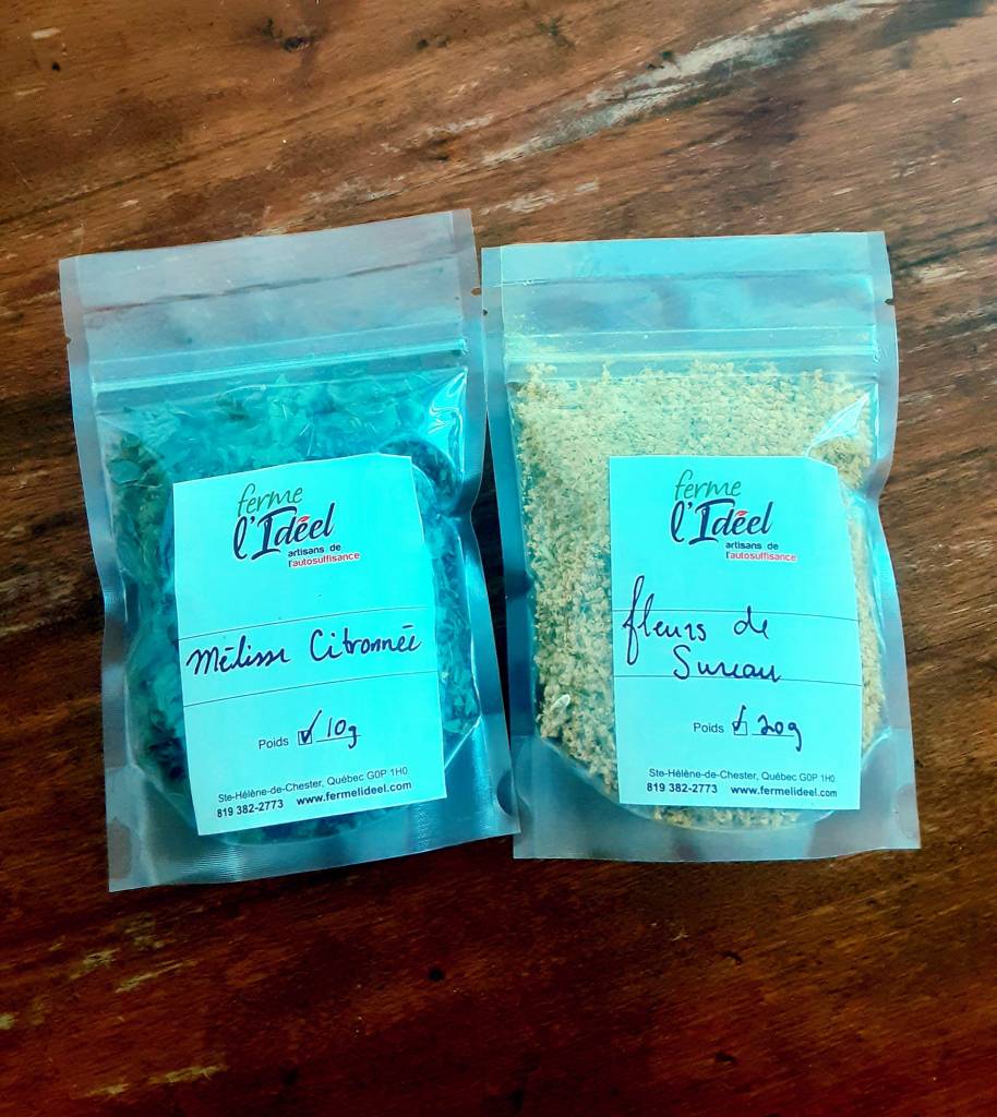 Depuis 15 ans déjà nous cultivons des plantes à tisanes sur la ferme; Menthe, Agastache fenouil, Mélisse pour ne nommer que celles-ci. Mais la nature brute nous fournit aussi en feuilles et fleurs à sécher: pensons aux framboisiers, mêriers, sureau, tilleuls, cèdres et autre magnifiques plantes que l’on retrouve naturellement sur notre exploitation.